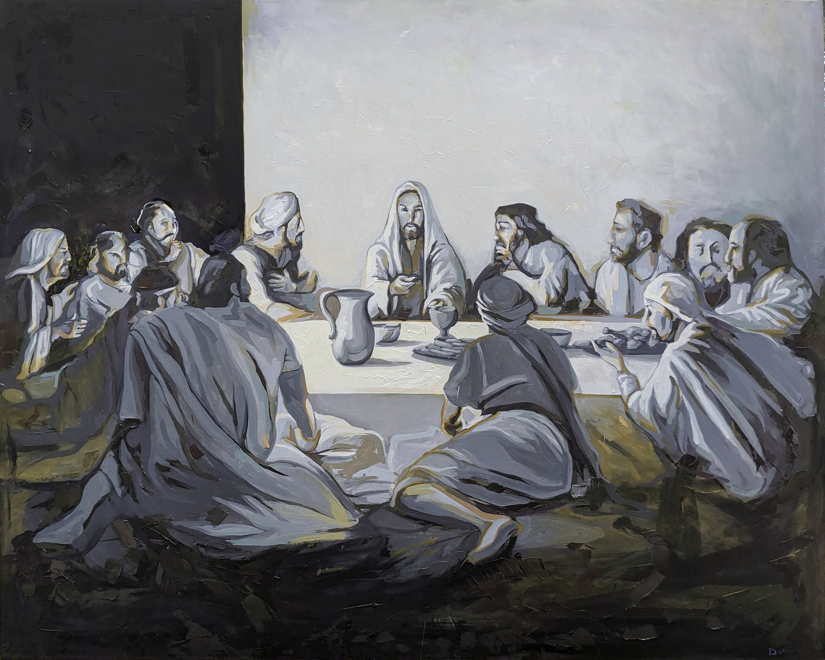 I love the representational history of biblical stories. So many great artists have taken the events of the Bible as their subject matter that it has vivified the imagination of the West through our cultural heritage. My representation of the last supper that Jesus shares with His disciples before He is crucified has been informed by that tradition a great deal, but I have changed some of the established tropes that do not fit with the Biblical narrative. In researching to correct those tropes, I have learned a lot about the Last Supper that has changed by conception of it from what it has been up to now. This process has brought me closer to the events, helped me to understand them better, and in the process has been a devotional exercise that has brought me closer to my Lord. I am including this note along with the painting so that I can document and share some of the things that I learned.
